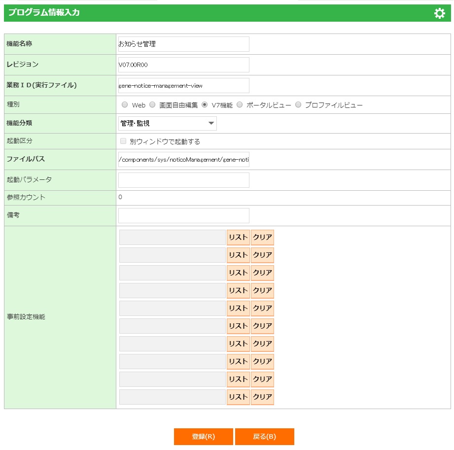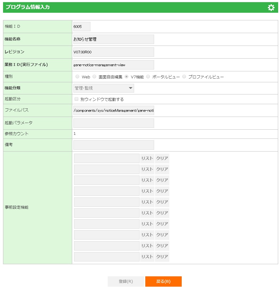 ・ 「登録(R)」を押下すると、入力した内容で機能の情報を登録した後、プログラム登録画面に戻ります。