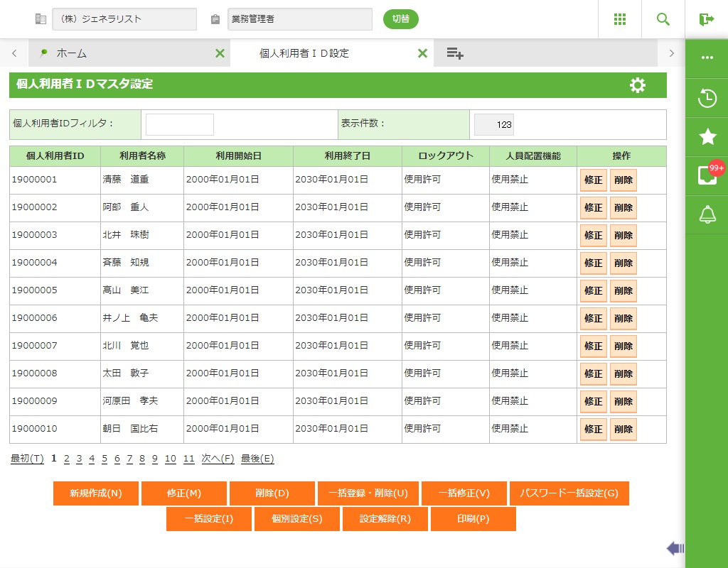 システムの個人利用者と、そのパスワードを個別/一括で登録、修正、削除します。また、利用許可社員リストを個別/一括で登録、修正、削除します。