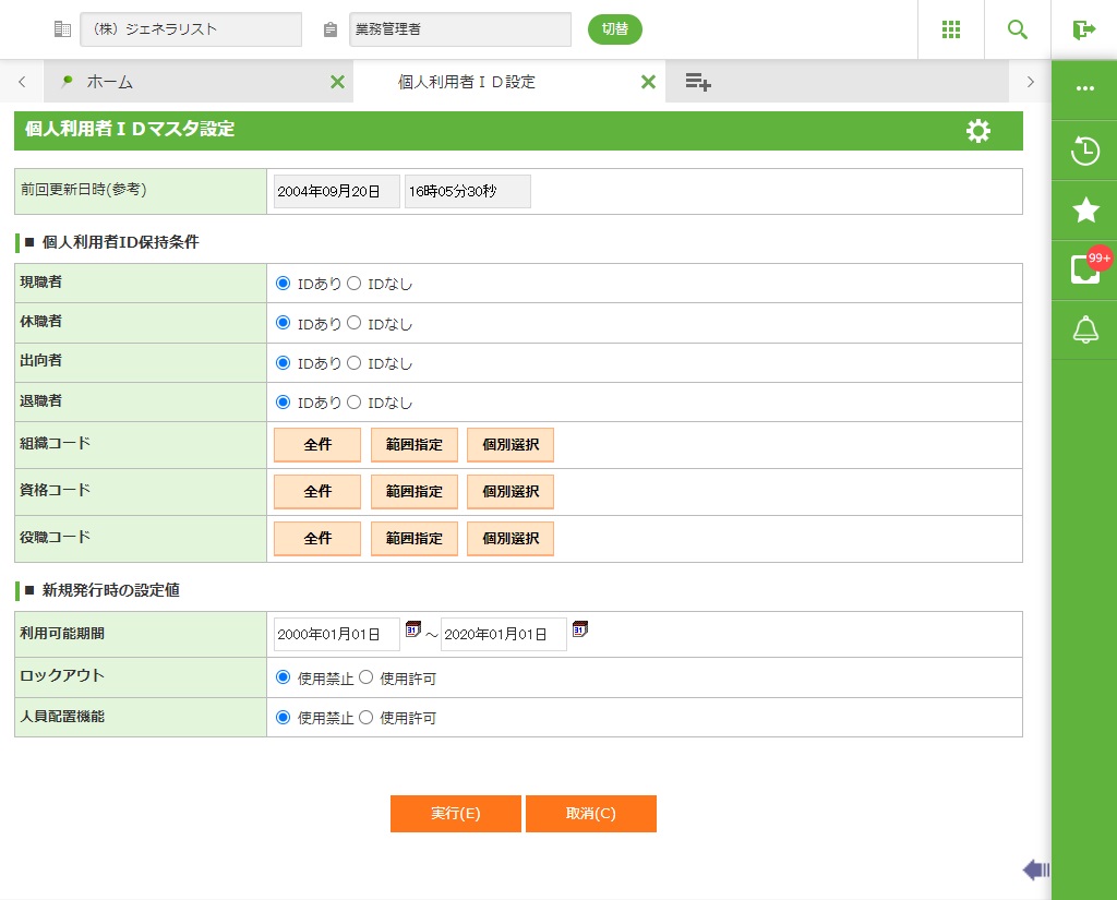 個人利用者IDを人事システムの基本情報に登録されている現職状態に応じて、自動的に作成/削除を行うための個人利用者ID一括登録・削除画面を表示します。一括処理終了後は、本画面に戻り、(個人利用者IDフィルタの設定にしたがって)一覧の再表示が行われます。 |