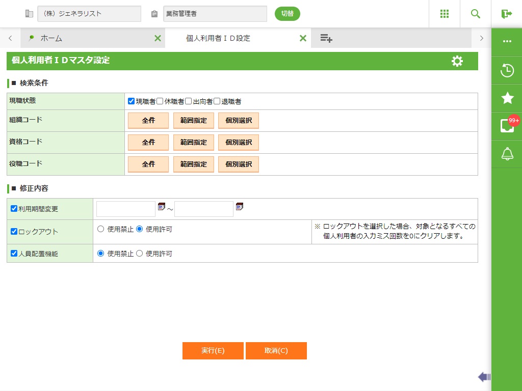 検索条件に合致する社員コードをアクセス可能なすべての個人利用者IDのロックアウト設定を修正することを指定します。使用禁止/使用許可を選択します。 |