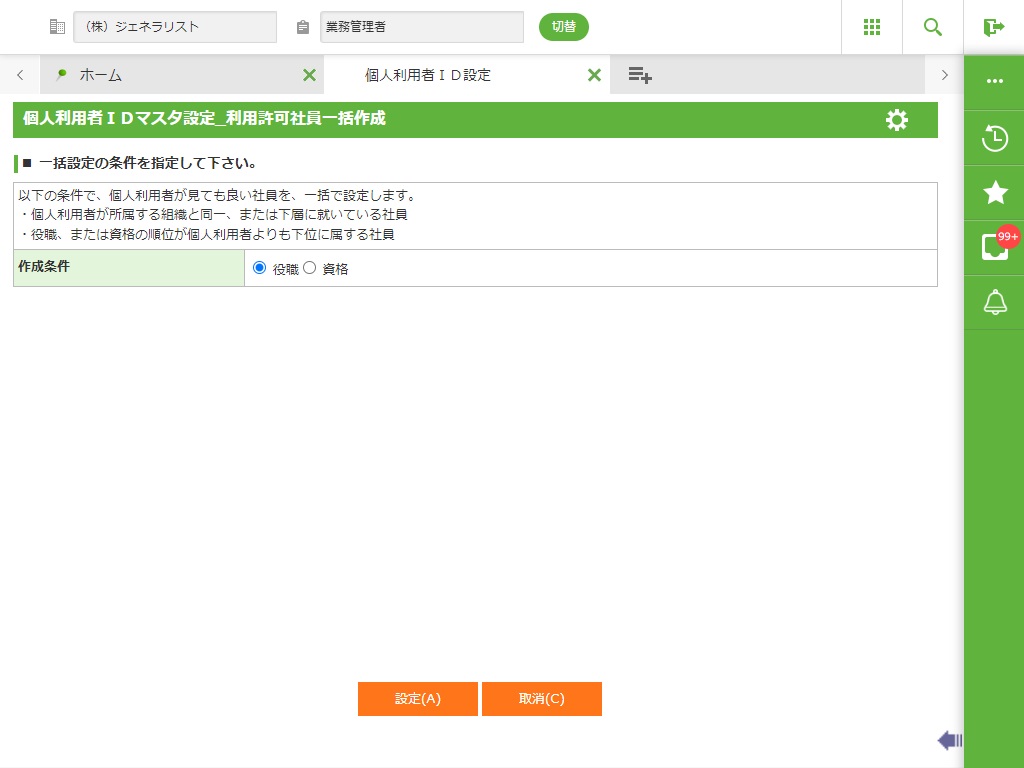 以下の条件で、個人利用者が見ても良い社員を、一括で作成します。 ・ 個人利用者が所属する組織と同一、または ・ 役職、または資格の順位が個人利用者よりも 作成条件を選択します(役職:役職順位を元に、資格:資格順位を元に作成します)。一括設定条件.作成条件が役職、資格以外、またはそのレコードがない場合は、役職に設定されます。 |