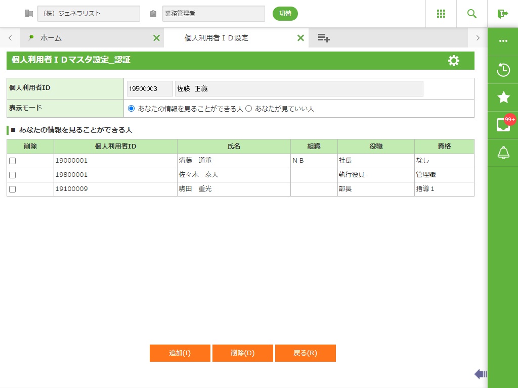 情報を参照しても良い個人利用者IDが表示されます。 |