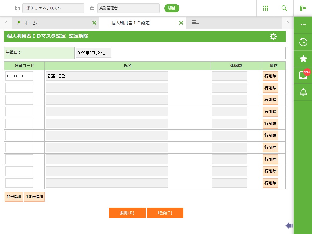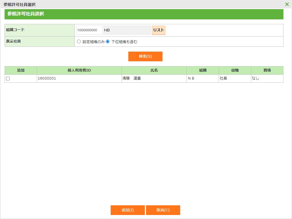 参照社員選択画面を開き、一覧に個人利用者IDを追加します。 |