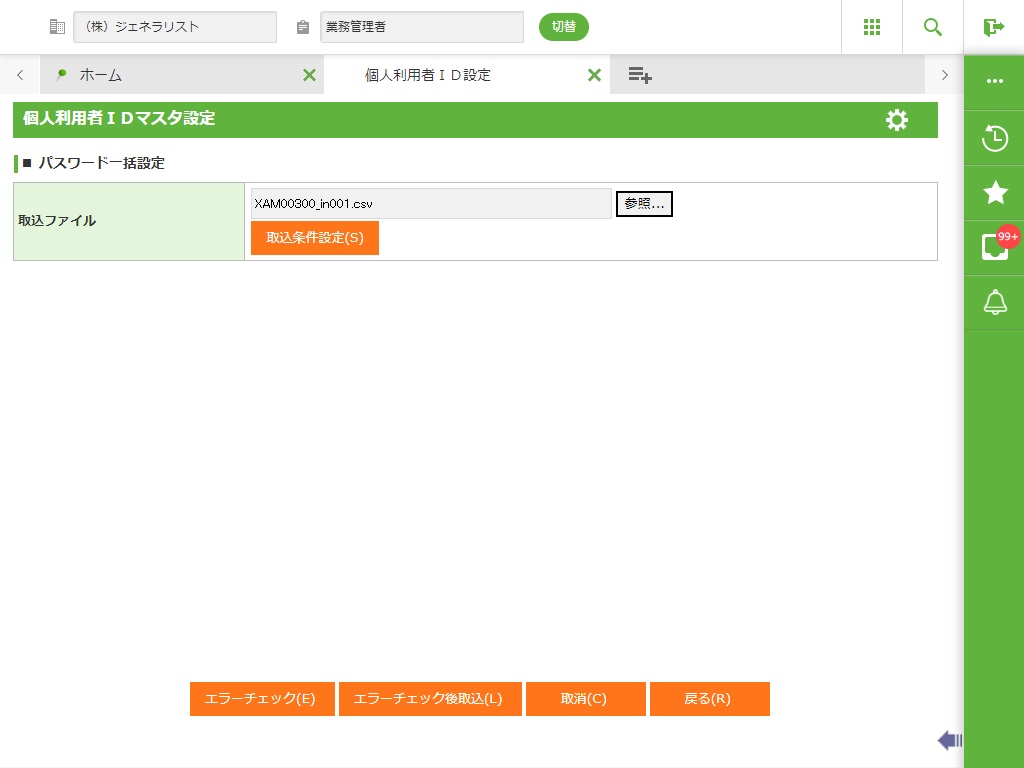 ・ 個人利用者IDのパスワードを取込ファイルで一括設定します。