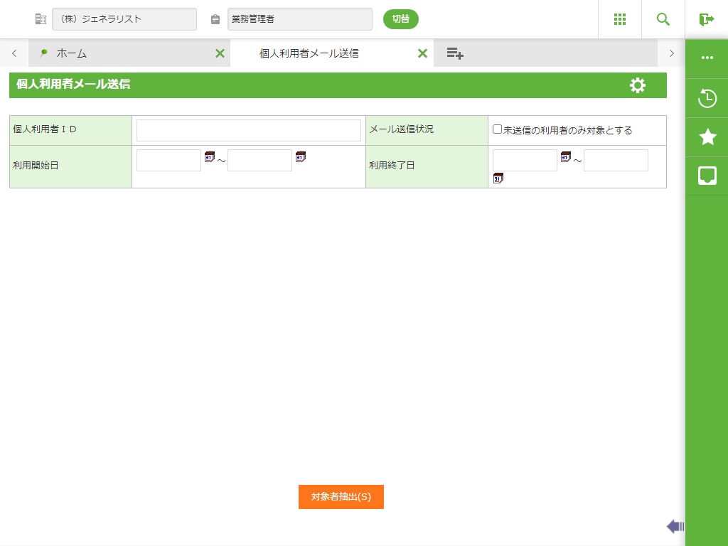 指定された条件に合致する個人利用者を抽出し、「送信画面」に遷移します。 条件が指定されていない場合には全件を抽出します。 |