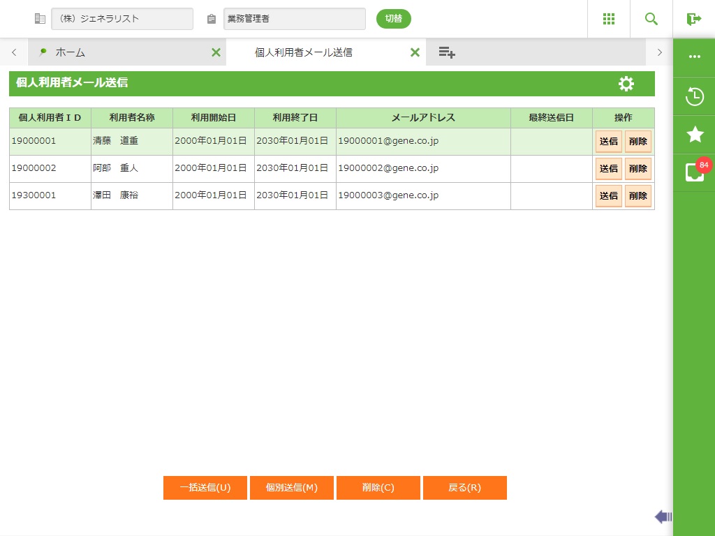 選択した行の個人利用者のみメールを送信します。 |