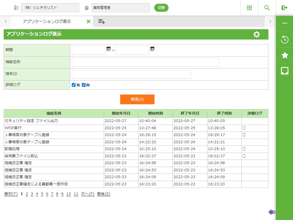 ・機能名称を選択すると、詳細ログを表示します。詳細ログの無いログの機能名称をクリックした場合、詳細画面に遷移しますが、詳細ログの内容は表示されません。