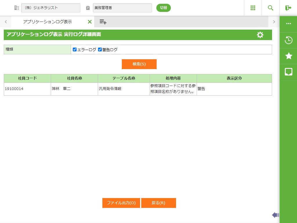 ・機能を実行中、エラーが発生すると、アプリケーションログ表示画面に遷移します。(例、給与計算機能。)