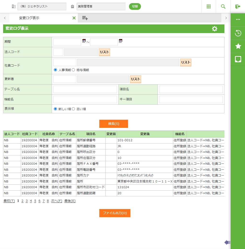 入力した検索条件で変更ログを検索した結果をCSVファイルに出力します。 |