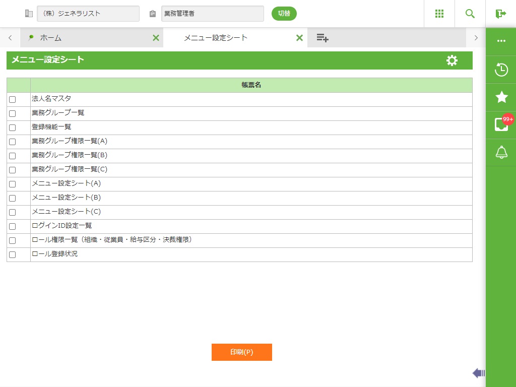 ・ メニュー設定シート 業務グループ権限一覧(A) サンプル帳票