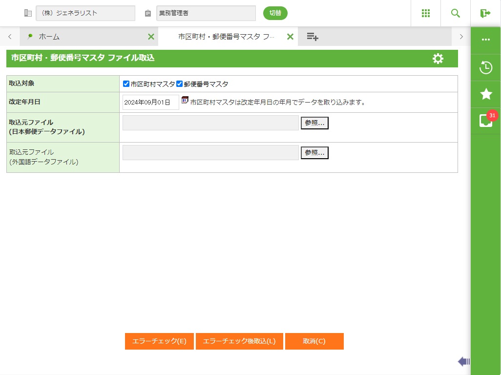 ・ 取込対象に郵便番号マスタのみを指定した場合、市区町村マスタに郵便番号データに対応した市区町村のデータが存在しない場合などのデータに不整合が生じる場合があります。郵便番号マスタを取込む場合には、市区町村マスタと同時に取り込む運用をお勧めします。