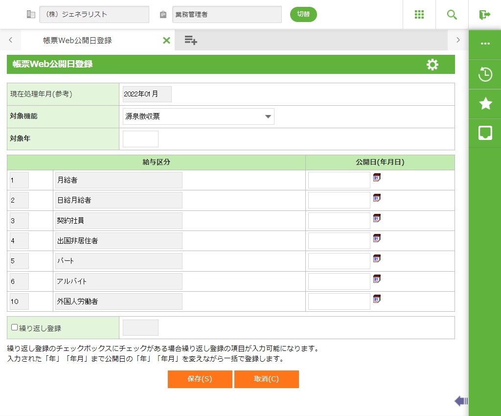 帳票Web公開マスタで公開区分を「使用する」に設定した対象機能に対し、公開日を給与区分毎に設定します。