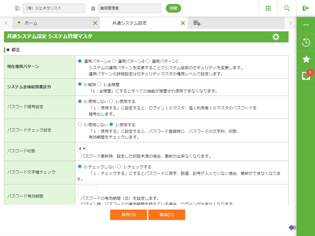 ・運用パターン、パスワードの管理方式を登録します。