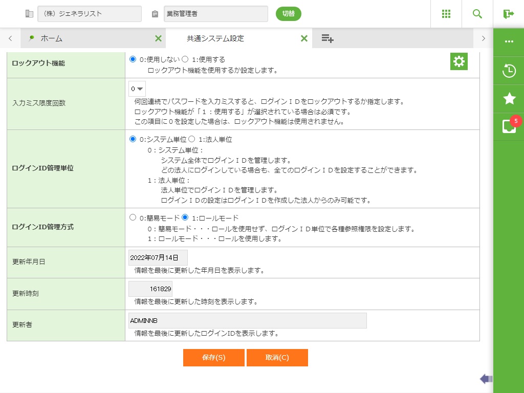 ・ ログインIDのロックアウトは、ログインIDマスタ・個人利用者IDマスタの「ロックアウト」を「使用可能状態」にすることで、解除されます。