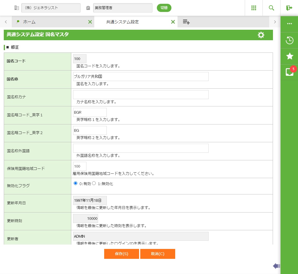 ・ 新規登録時は、以下の項目に入力します。修正時は、指定した国名コードの情報が表示されますので、必要な情報を修正します。無効/有効化時は、指定した国名コードの情報が表示されますが、入力はできません。内容を確認して<保存>をクリックします。