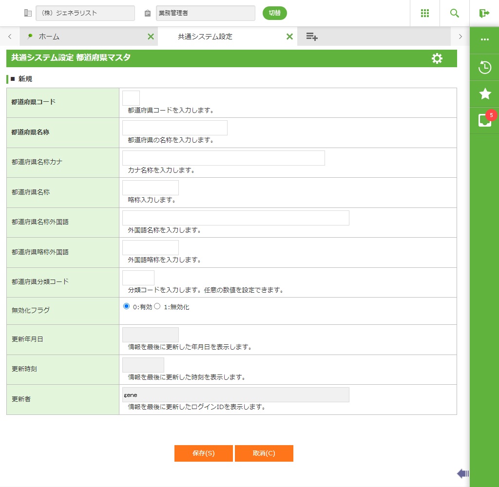 ・ 新規登録時は、以下の項目に入力します。修正時は、指定した都道府県コードの情報が表示されますので、必要な情報を修正します。無効/有効化時は、指定した都道府県コードの情報が表示されますが、入力はできません。内容を確認して<保存>をクリックします。