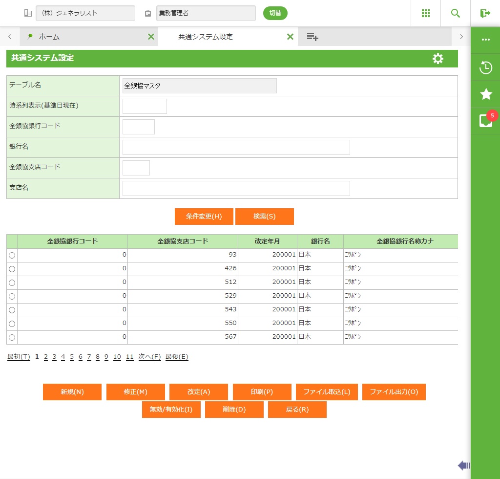 銀行の合併などにより使用している全銀協マスタに変更がある場合、全銀協に関する改定情報の登録を行います。