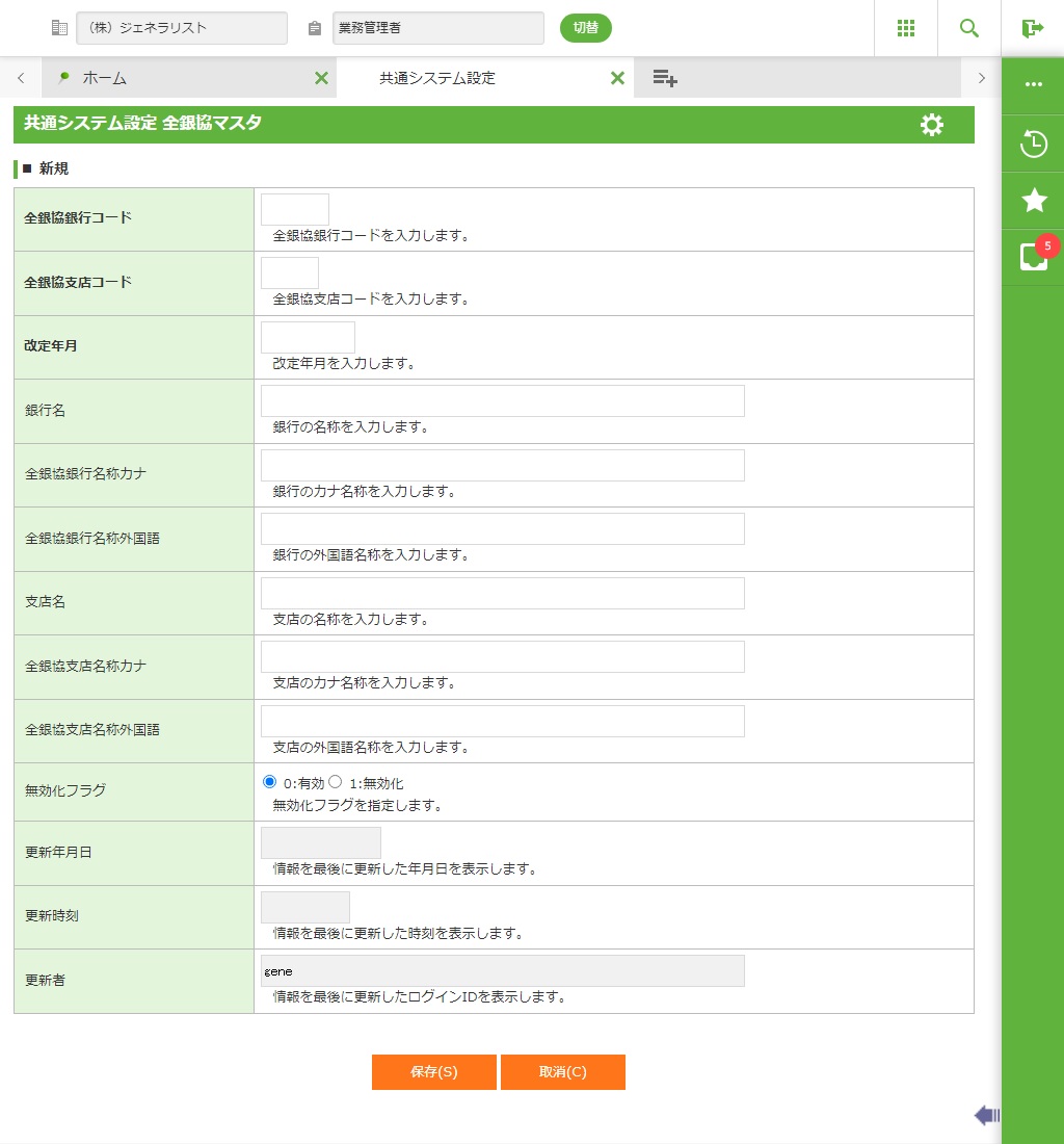 全銀協マスタの情報を新規登録します。詳細画面が表示されます。 |