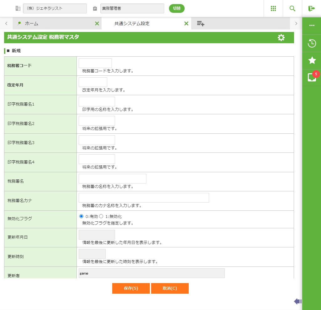 税務署コードの情報を新規登録します。詳細画面が表示されます。 |