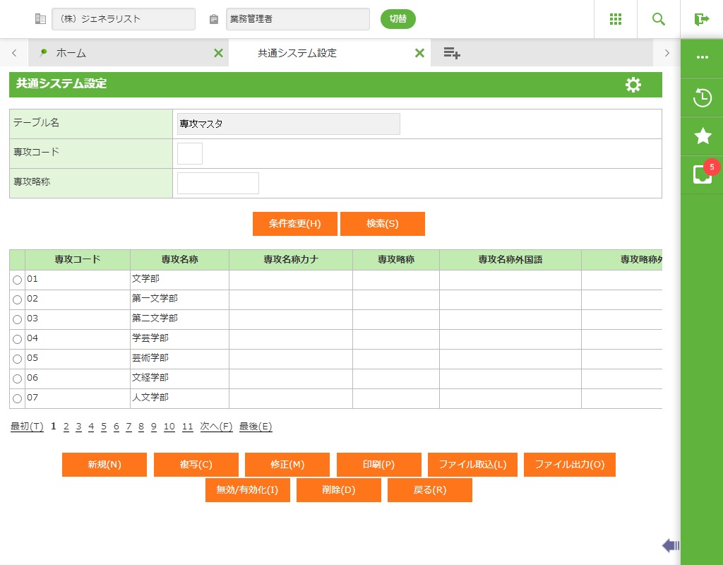 登録されている専攻コードの一覧が表示されます。 |