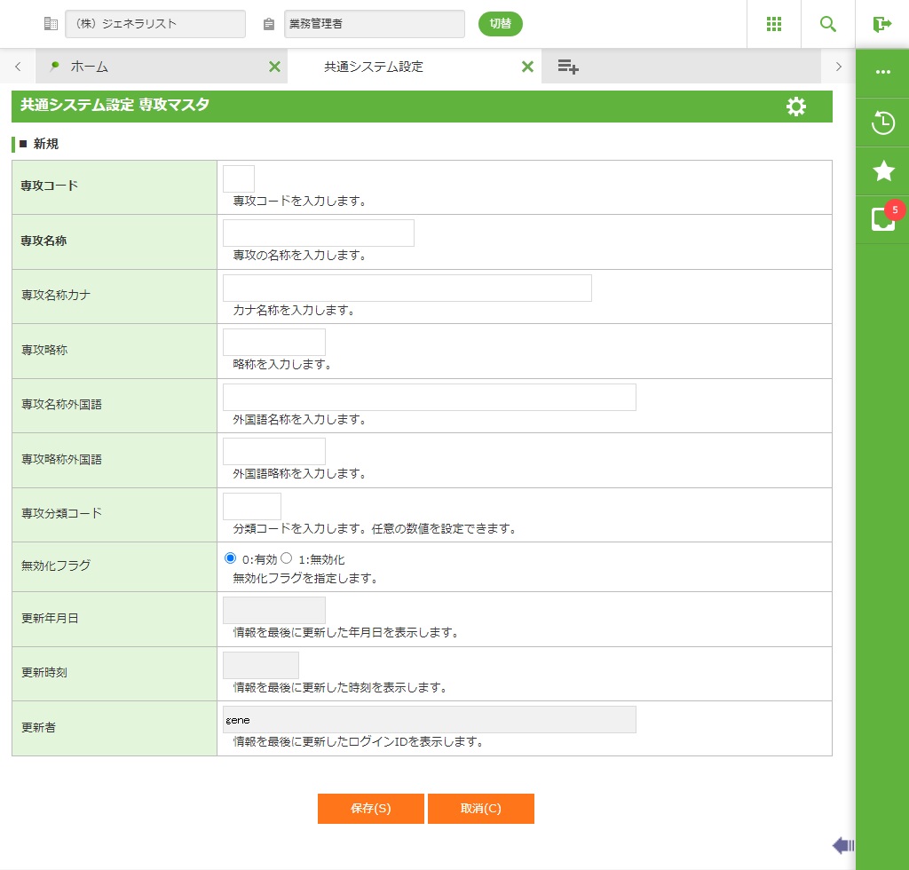 ・ 新規登録時は、以下の項目に入力します。修正時は、指定した専攻コードの情報が表示されますので、必要な情報を修正します。無効/有効化時は、指定した専攻コードの情報が表示されますが、入力はできません。内容を確認して<保存>をクリックします。