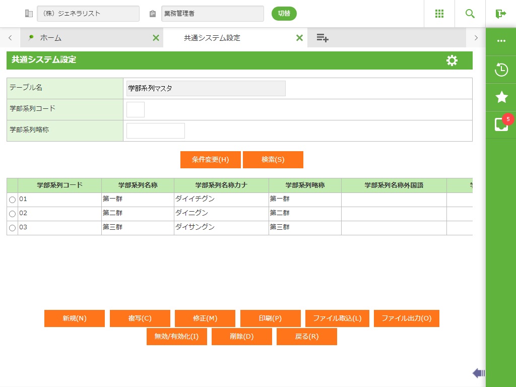 学部系列の情報を新規登録します。詳細画面が表示されます。 |