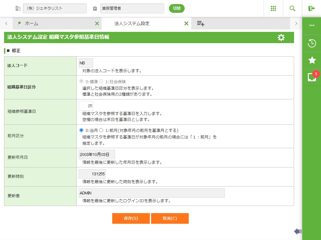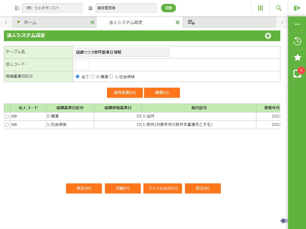 組織マスタ取得条件となる基準日を入力します。 標準と社会保険用の2種類登録できます。 空欄の場合は末日を基準日とします。 |