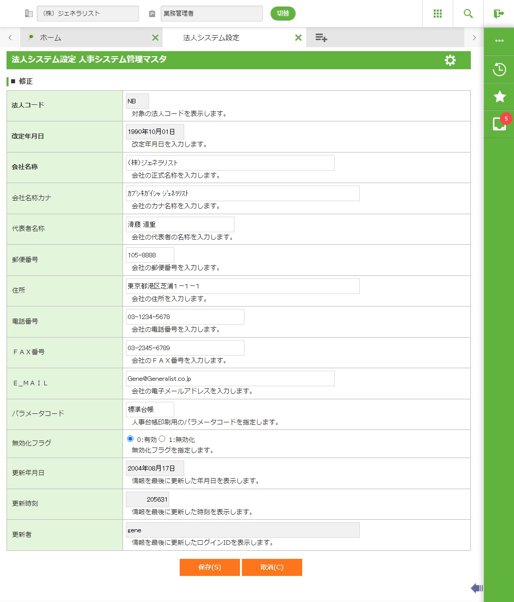 会社名や代表住所など、人事情報システムで利用する情報を設定します。