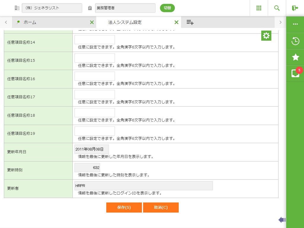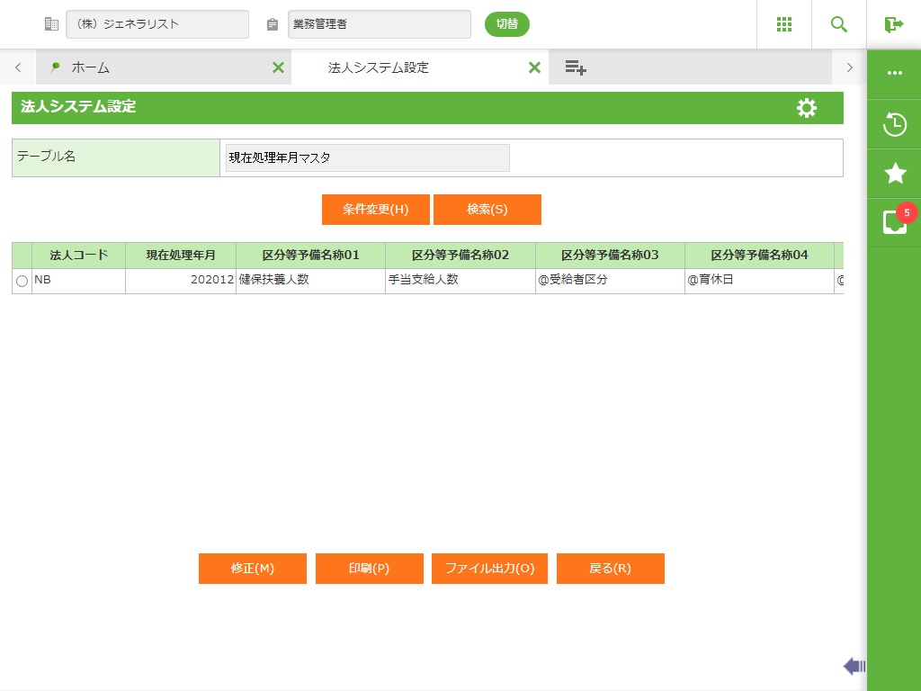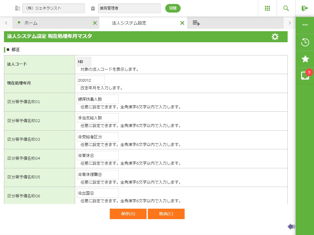現在処理年月、予備名称、組織体系名称を登録します。