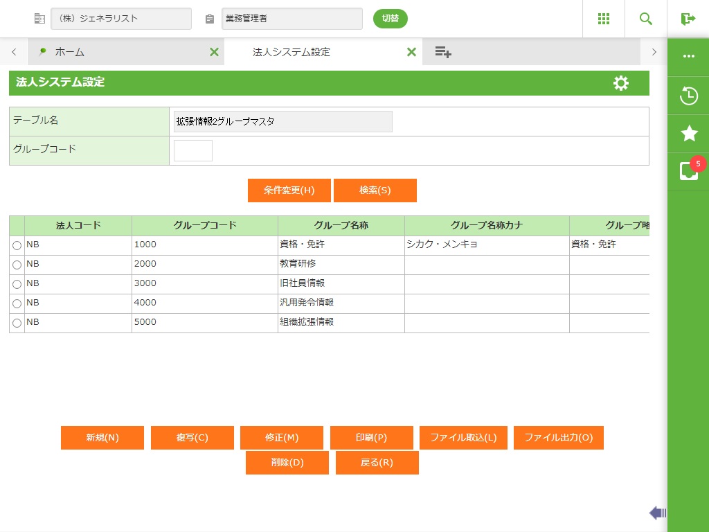 拡張情報2種別コードのグルーピングを行うグループコードを登録します。拡張情報2種別を参照入力(リストボタンよりコード選択)する際にグループ化した種別で検索が行えます。 登録されたグループコードは拡張情報2種別マスタ設定のグループコード設定で設定します。