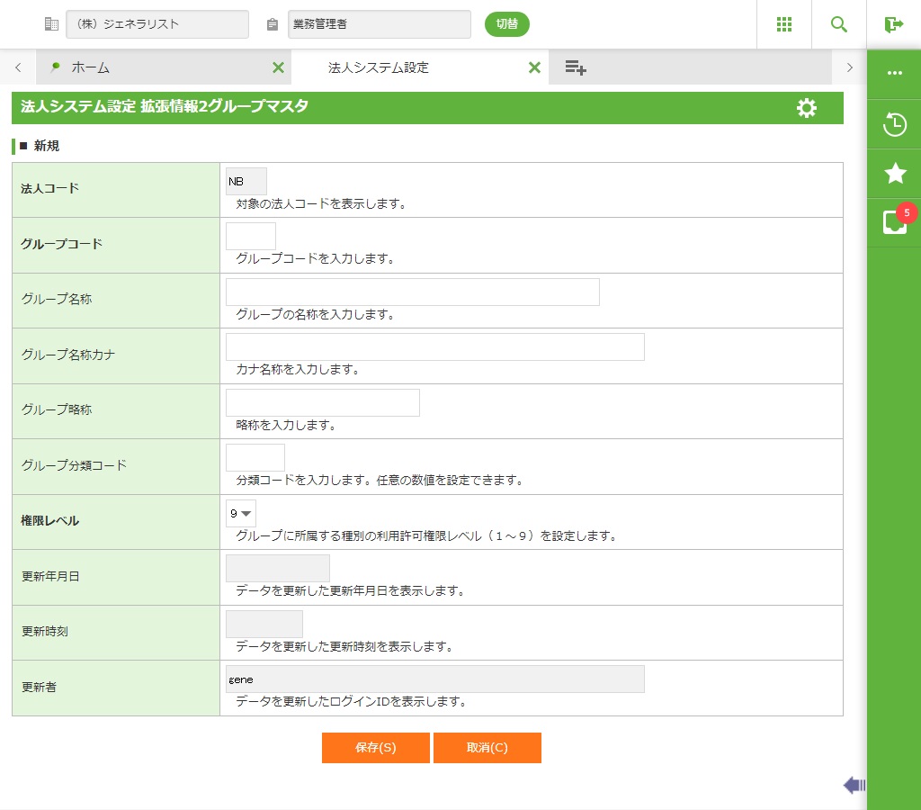 ・ 新規登録時は、以下の項目に入力します。修正時は、指定したグループコードの情報が表示されますので、必要な情報を修正します。