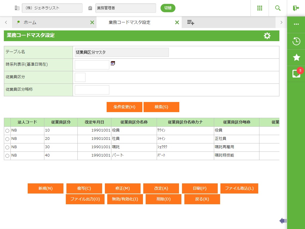 登録されている従業員区分マスタの一覧が表示されます。 |