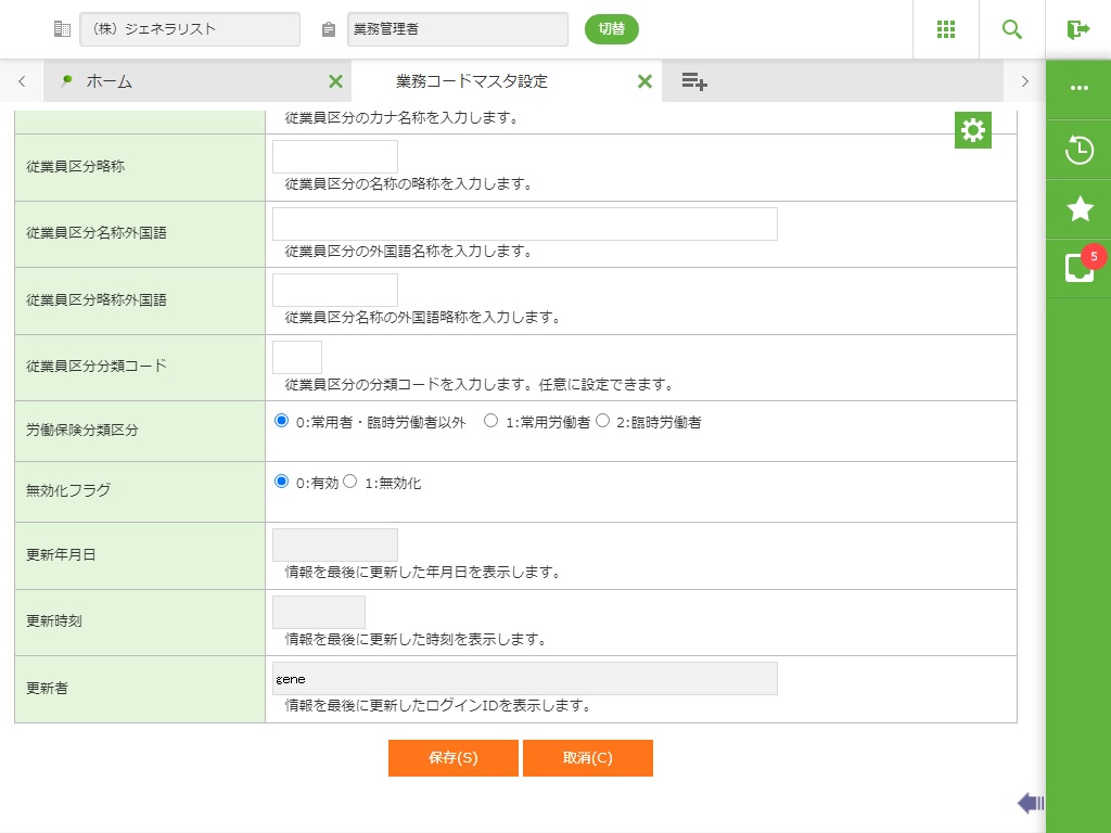 従業員区分マスタを新規登録します。詳細画面が表示されます。 |
