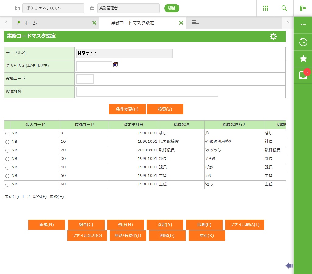 役職マスタを新規登録します。詳細画面が表示されます。 |