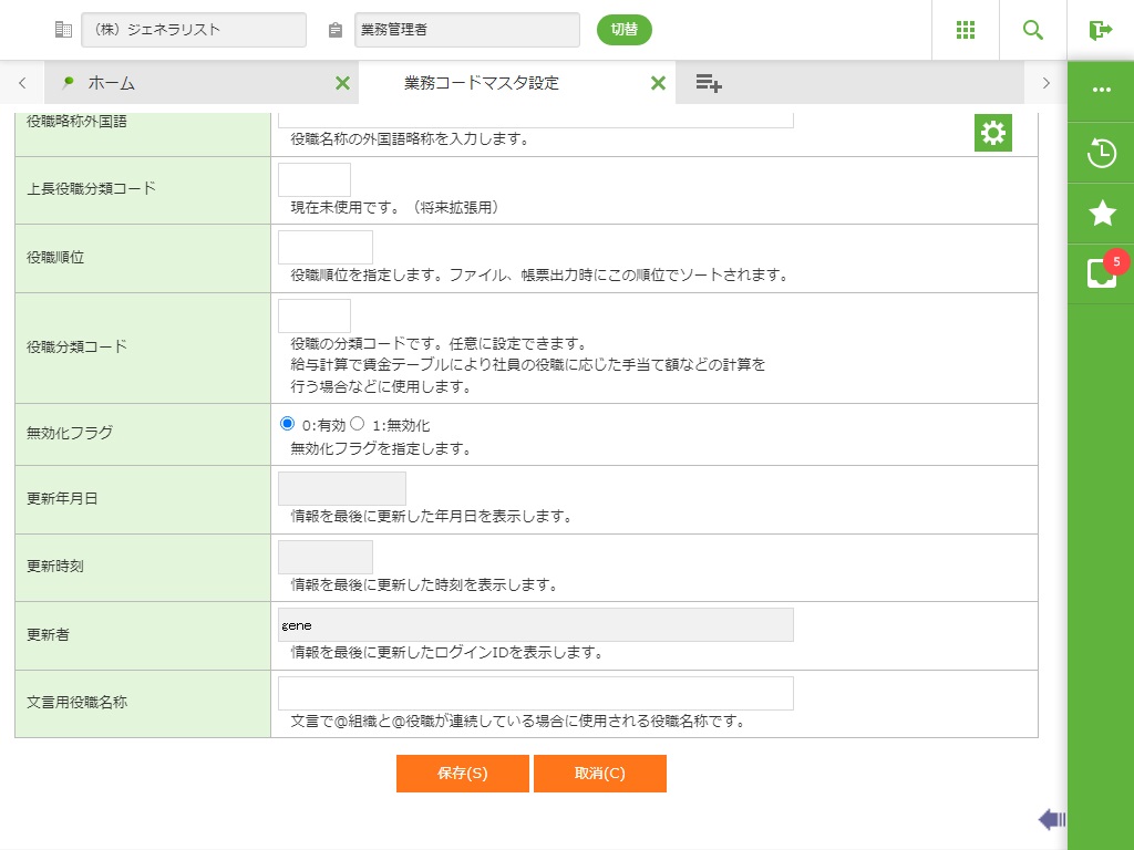 ・ 新規登録時は、以下の項目に入力します。修正時は、指定した役職コードの情報が表示されますので、必要な情報を修正します。改定時は、最新情報が表示されますので、必要な情報を入力し直します。無効化時は、指定した役職コードの情報が表示されますが、入力はできません。内容を確認して<保存(S)>をクリックします。