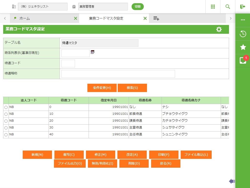 待遇の分類コードです。任意に設定できます。 給与情報システム「Generalist/PR」で、賃金テーブルにより社員の待遇に応じた手当て額などの計算を行う場合に使用します。 |