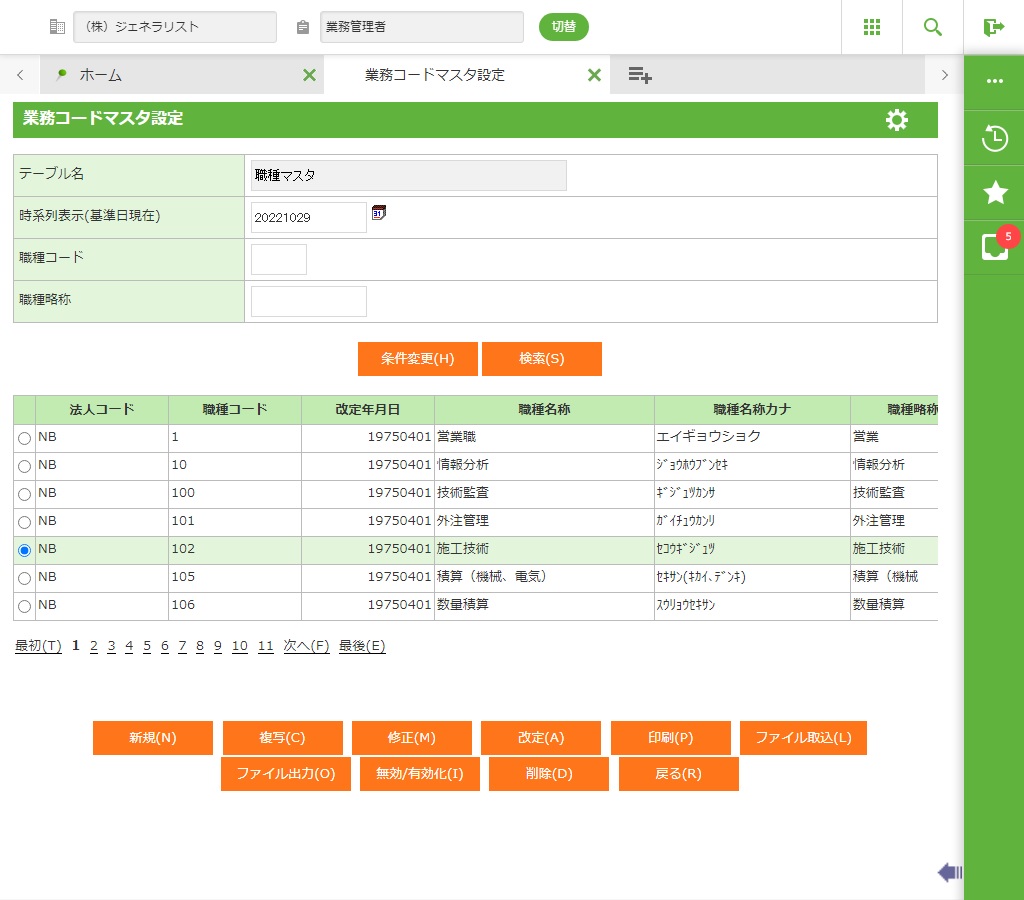 選択した職種マスタの改定を作成します。詳細画面が表示されます。 |