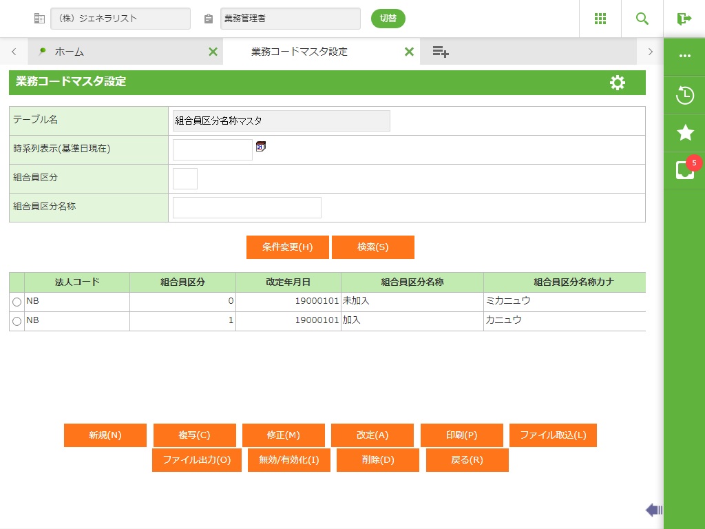 登録されている組合員区分名称マスタの一覧が表示されます。 |