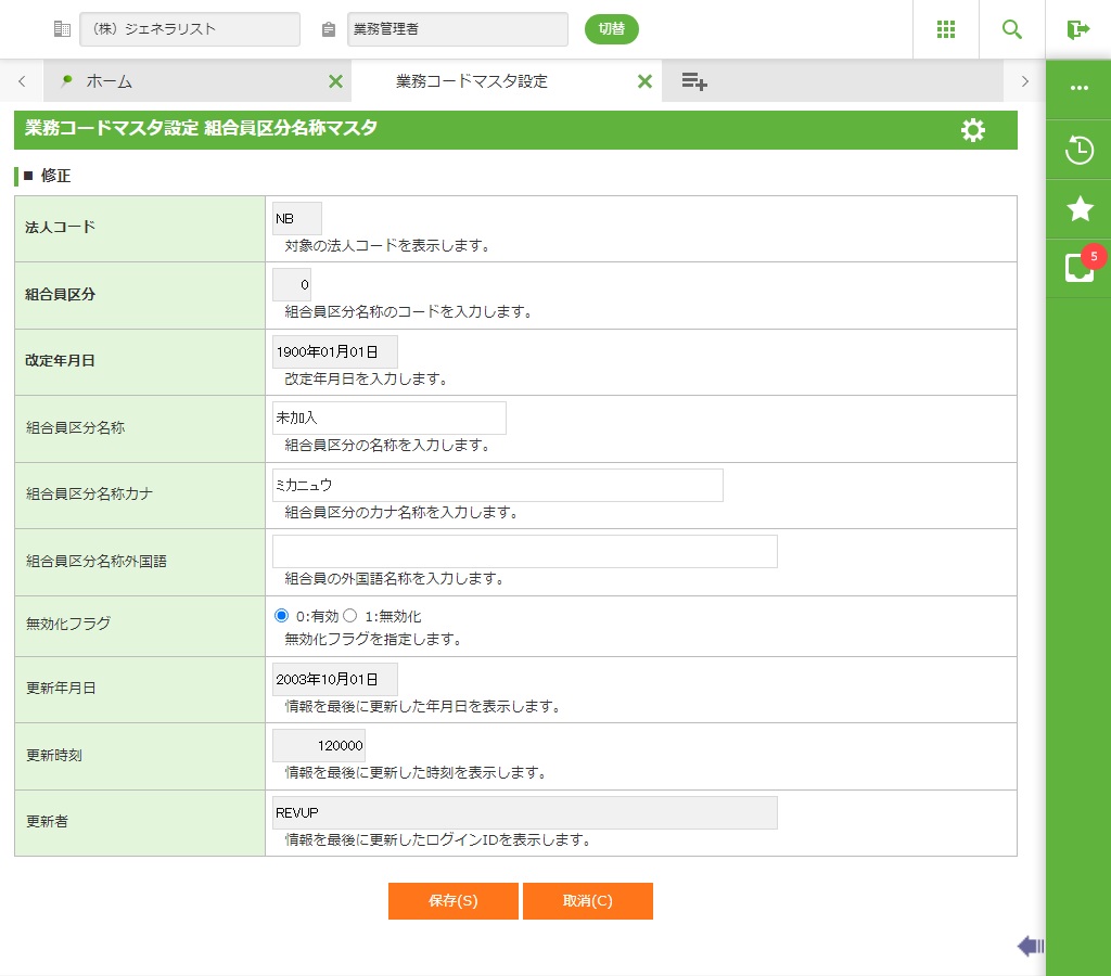 ・ 新規登録時は、以下の項目に入力します。修正時は、指定した組合員区分名称の情報が表示されますので、必要な情報を修正します。無効/有効化時は、指定した組合員区分の情報が表示されますが、入力はできません。内容を確認して<保存(S)>をクリックします。