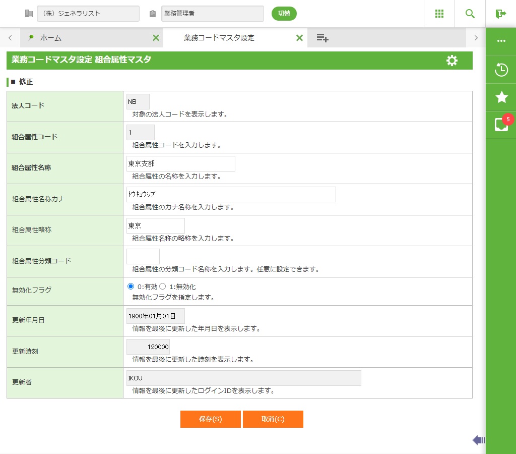 ・ 新規登録時は、以下の項目に入力します。修正時は、指定した組合属性コードの情報が表示されますので、必要な情報を修正します。無効/有効化時は、指定した組合属性コードの情報が表示されますが、入力はできません。内容を確認して<保存(S)>をクリックします。