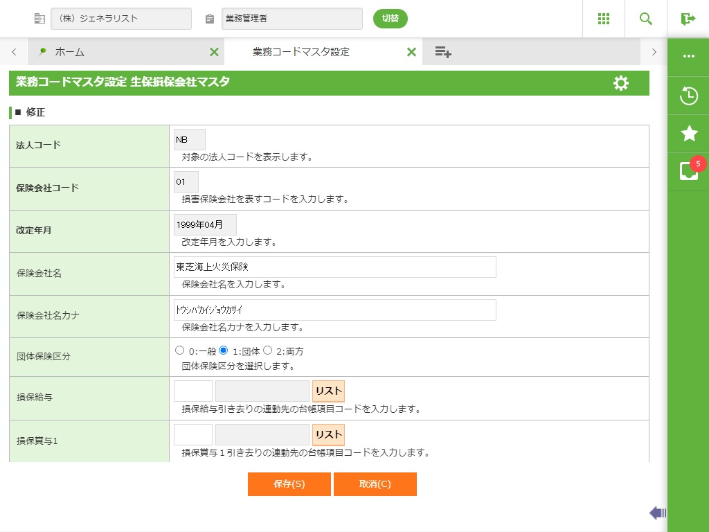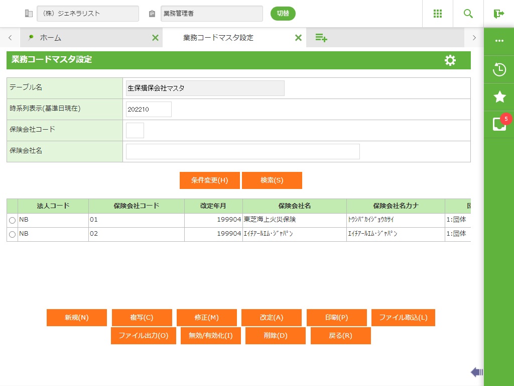 登録されている生保損保会社マスタの一覧が表示されます。 |