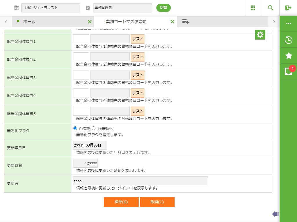 ・ 新規登録時は、以下の項目に入力します。修正時は、指定した生保損保会社マスタの情報が表示されますので、必要な情報を修正します。無効/有効化時は、指定した生保損保会社マスタの情報が表示されますが、入力はできません。内容を確認して<保存(S)>をクリックします。