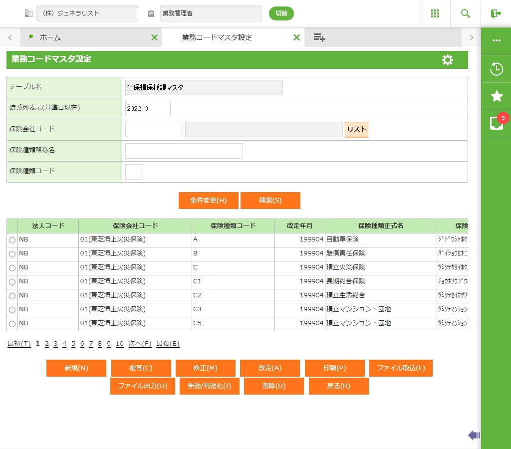 登録されている生保損保種類マスタの一覧が表示されます。 |