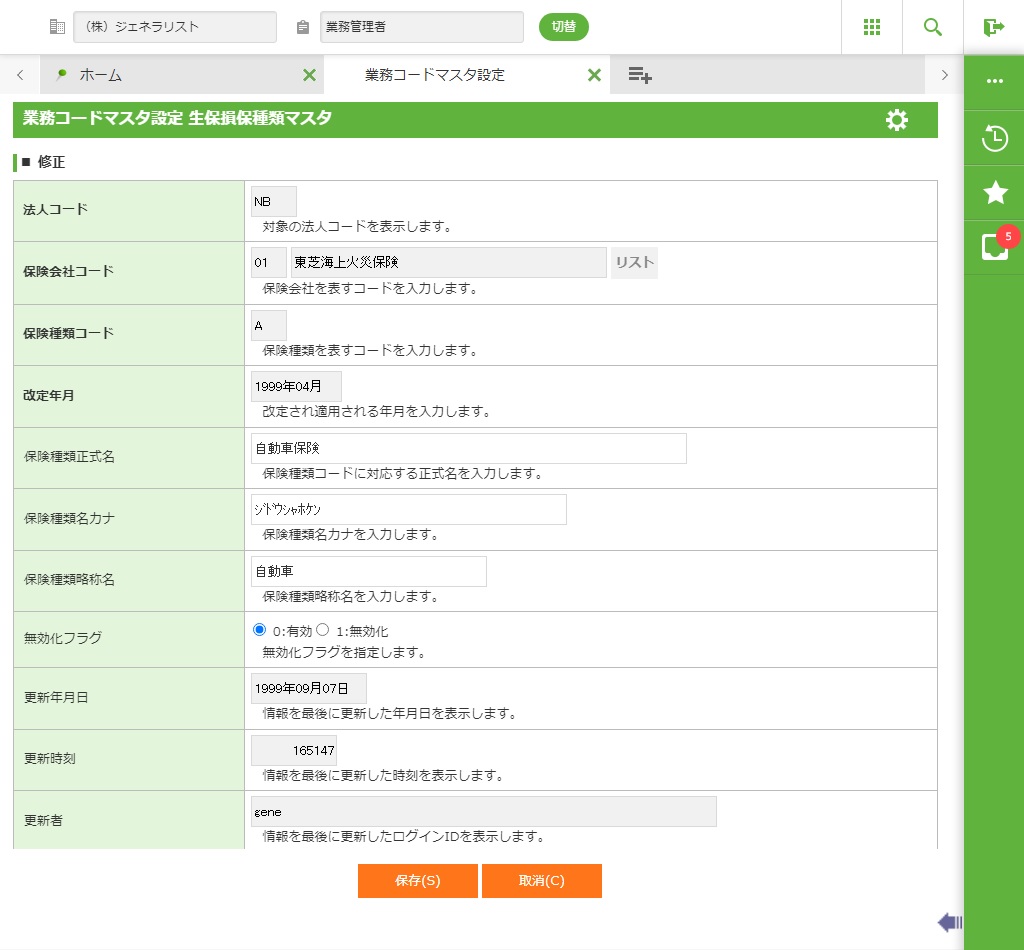 生保損保種類マスタを新規登録します。詳細画面が表示されます。 |