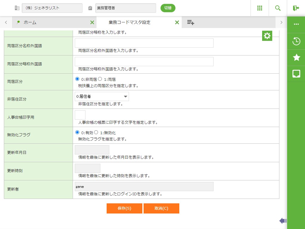 ・ 新規登録時は、以下の項目に入力します。修正時は、指定した同居区分マスタの情報が表示されますので、必要な情報を修正します。無効/有効化時は、指定した同居区分マスタの情報が表示されますが、入力はできません。内容を確認して<保存(S)>をクリックします。