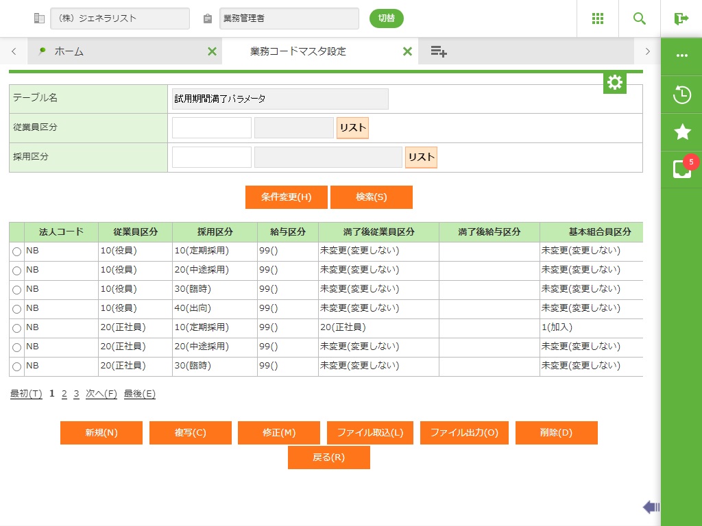 登録されている試用期間満了パラメータの一覧が表示されます。 |