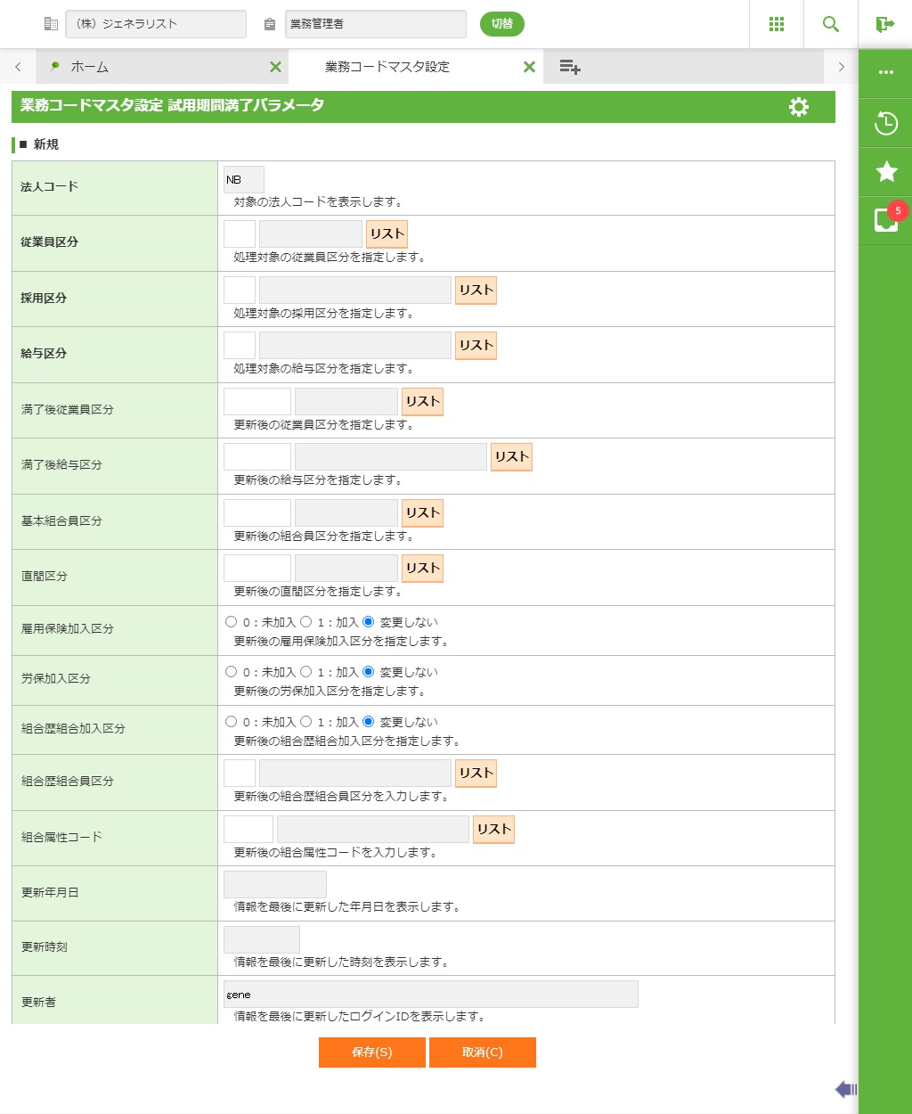 ・ 新規登録時は、以下の項目に入力します。修正時は、指定した試用期間満了パラメータの情報が表示されますので、必要な情報を修正します。内容を確認して<保存(S)>をクリックします。