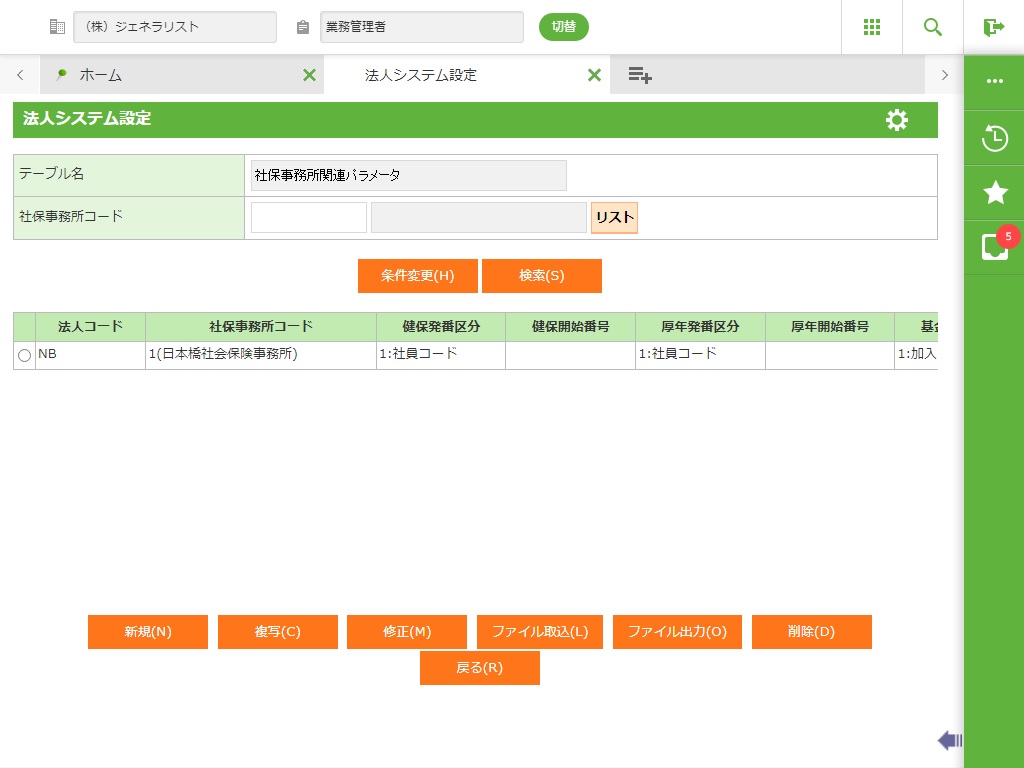 登録されている社保事務所関連パラメータの一覧が表示されます。 |