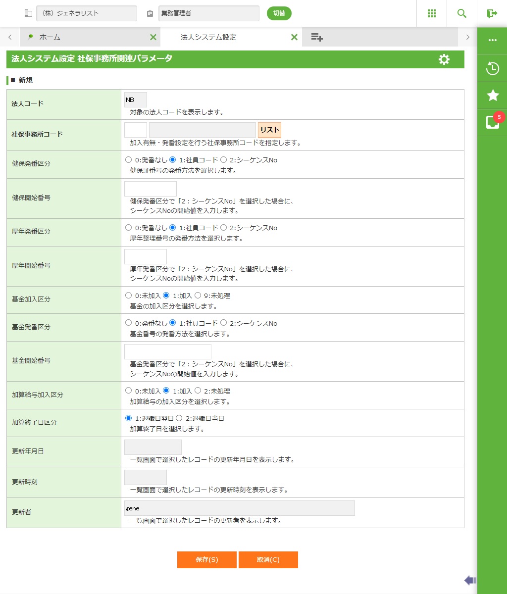 社保事務所関連パラメータを新規登録します。詳細画面が表示されます。 |