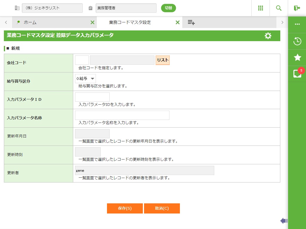 ・ 新規登録時は、以下の項目に入力します。修正時は、指定した控除データ入力パラメータの情報が表示されますので、必要な情報を修正します。内容を確認して<保存(S)>をクリックします。
